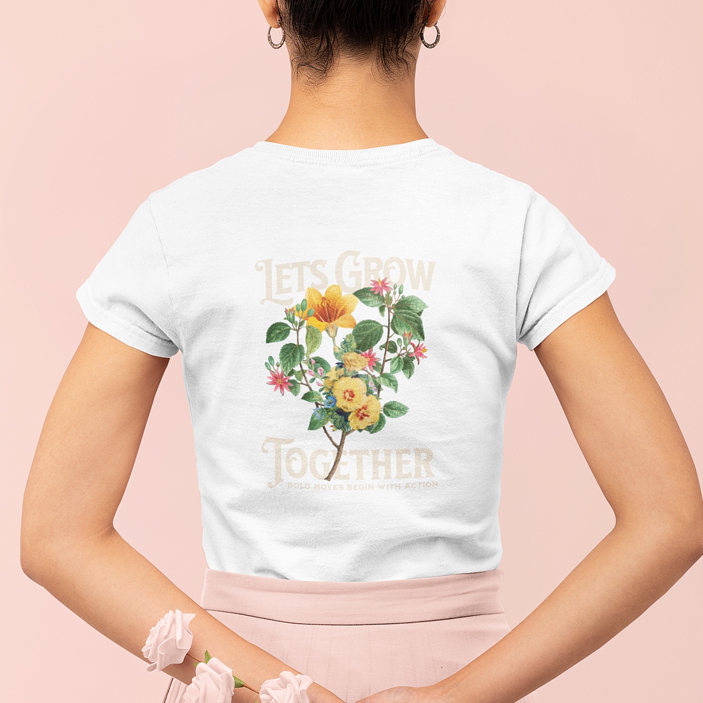 Dit Let's Grow Together dames t-shirt met quote en kleurrijke bloemenprint is leverbaar in zwart of wit. Dankzij de positieve tekst is het een prachtige outfit om in de lente en zomer te dragen. Het t-shirt is gemaakt van 100% katoen en heeft een damespasvorm. De kleding is leverbaar in maat XS t/m 3XL.