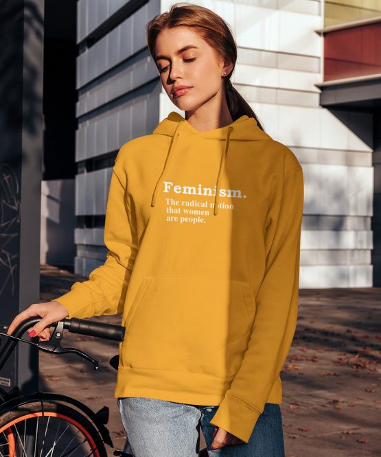 Deze feminisme hoodie met de definitie "Feminism. The radical notion that women are people." is iedereen die zichzelf een feminist noemt. Ideaal om cadeau te geven aan je feministische vriendin of om gewoon voor jezelf te bestellen. Deze unieke hoodies zijn leverbaar in vier kleuren: zwart, wit, geel en rood.