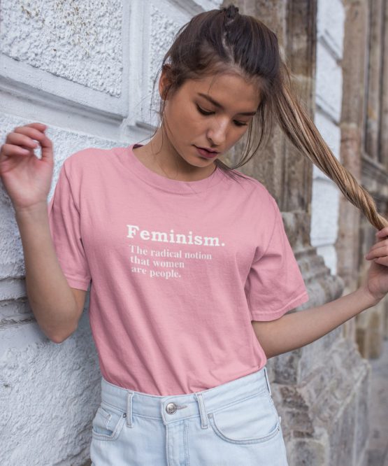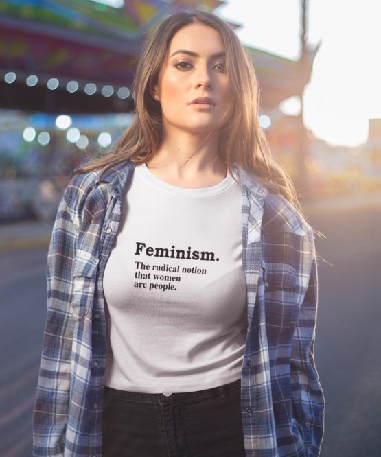 Bestel dit feminisme t-shirt met de definitie "Feminism. The radical notion that women are people." Verspreid deze algemene kennis en verhelder de mensen om je heen met een heldere boodschap. Dit unieke t-shirt met feministische tekst is verkrijgbaar in vier kleuren: zwart, wit, rood en roze. (Let op: alle kleding heeft een witte opdruk, behalve de witte variant.)