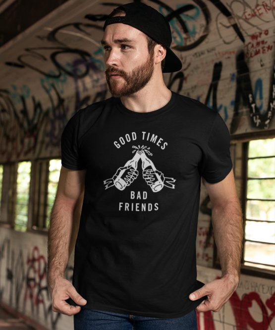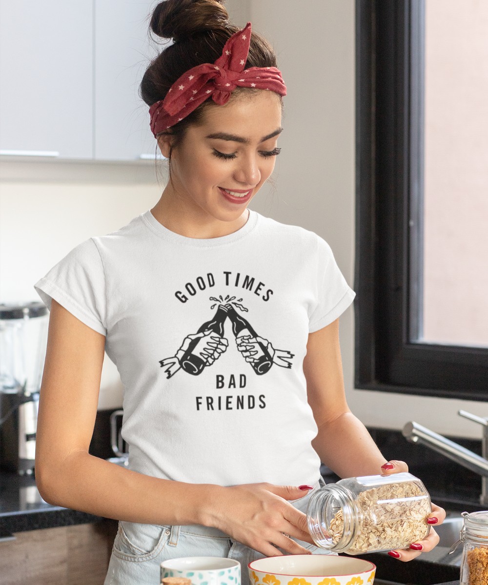 Dit t-shirt met Good Times Bad Friends op de borstzijde is speciaal voor al je 'slechte' vrienden en hun geouwehoer. Het leven is te kort om je aan de regels te houden, toch? Het shirt is verkrijgbaar in twee kleuren (zwart en wit) met een dames- of herenpasvorm. De boodschap van het shirt is duidelijk: het feest is aan!