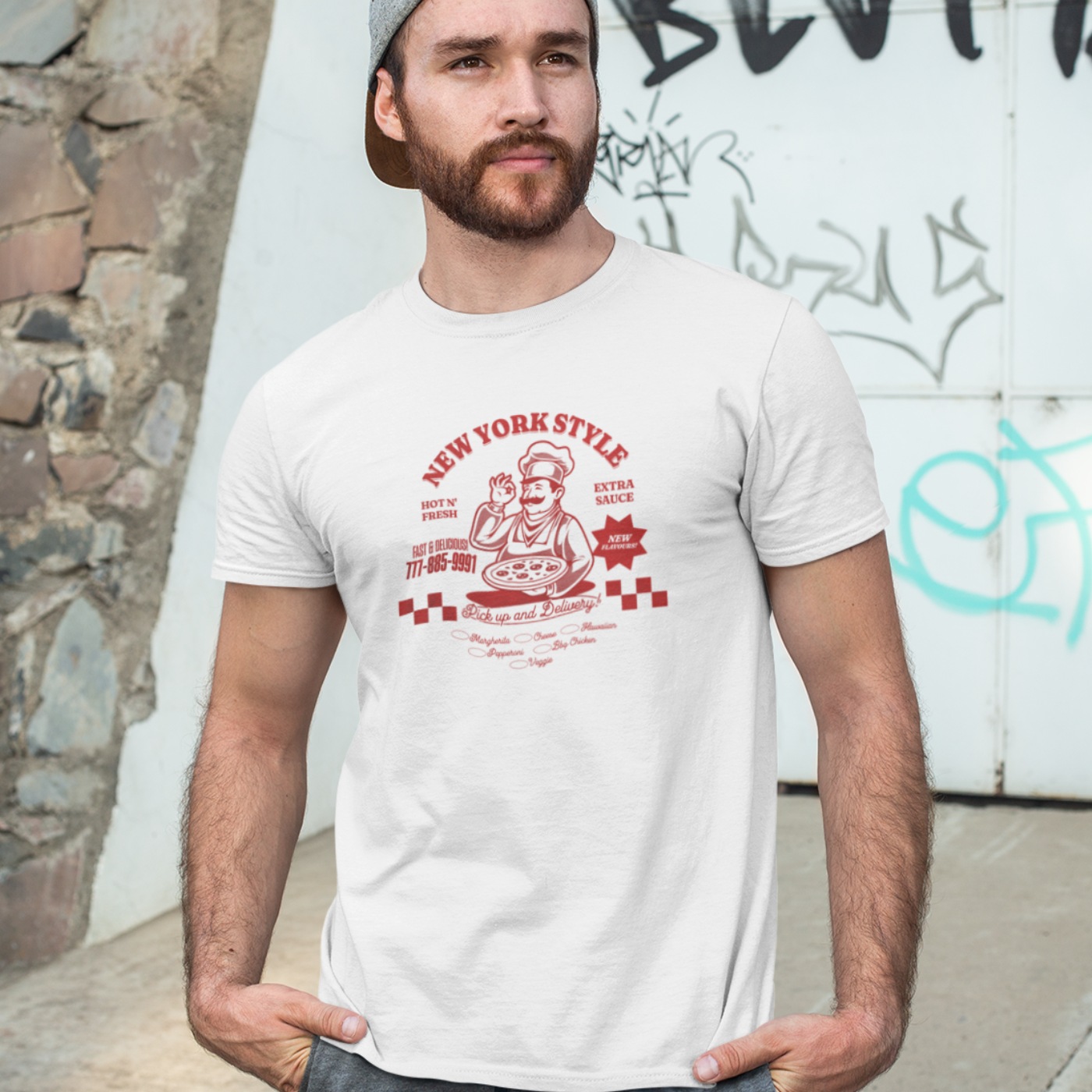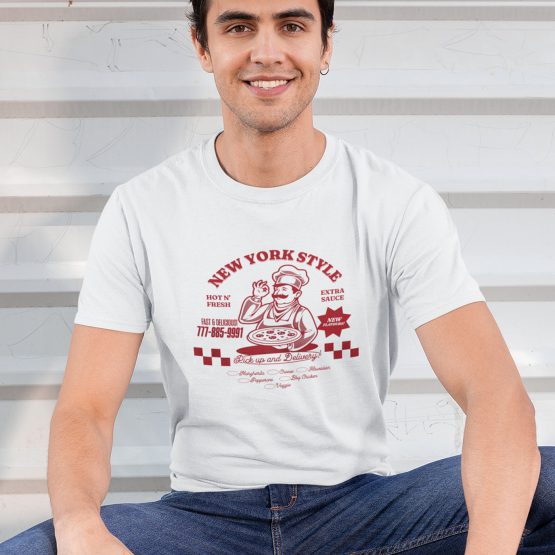 Dit grappige festival t-shirt met New York Style Pizza is voor iedereen die direct op zoek gaat naar een pizza-snack! Als je fan bent van deze Italiaanse lekkernij, dan is het sowieso een mooie aanvulling aan je garderobe. Het shirt is leverbaar met een dames- of een herenfit.