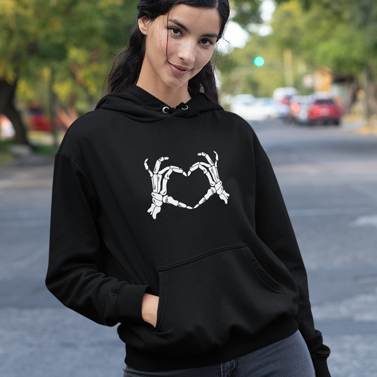 De Heart Hands op deze Halloween hoodie bestaan uit twee skelethanden die een hartje vormen. Voor de liefdevolle feestganger is dit de Halloween sweater bij uitstek. Leverbaar in de maten XS t/m 4XL, met uniseks pasvorm voor dames en heren.