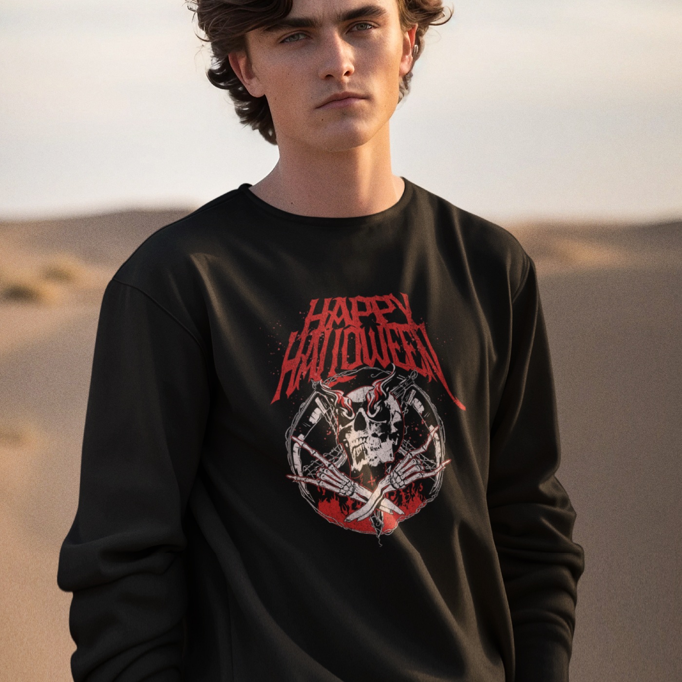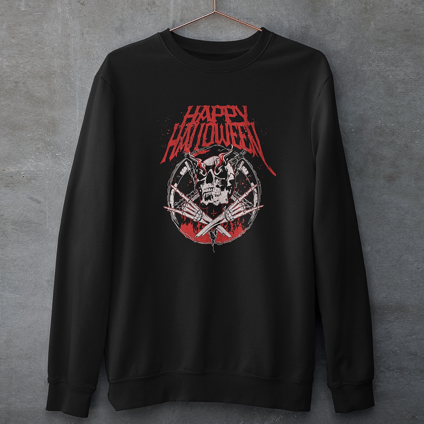 Zoek je een passende sweater voor Halloween? Dan is deze Happy Halloween trui met skelethoofd en rock 'n roll design echt iets voor jou! Deze feestkleding is verkrijgbaar in maat XS t/m 4XL, geschikt voor dames en heren door de uniseks fit.
