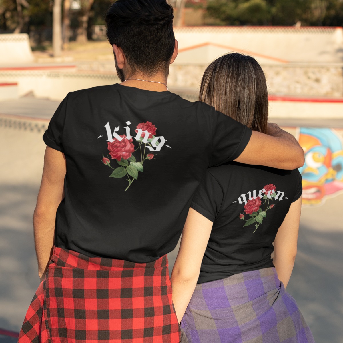 Deze unieke King Queen t-shirts met full color roos op de rug zijn alleen verkrijgbaar bij 1001Caps! Deze couple t-shirts zijn het ideale cadeautje voor stelletjes, maar ze zijn ook per stuk leverbaar. Heren kiezen uit de maten XS t/m 5XL en dames kiezen uit XS t/m 3XL.