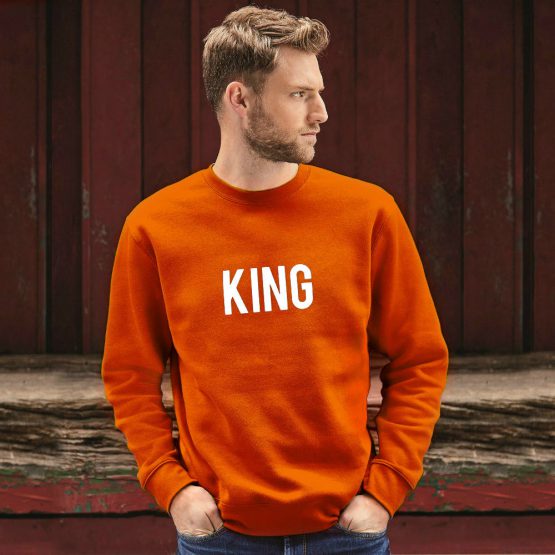 Deze klassieke King Queen trui hebben dit jaar speciaal voor Koningsdag aangepast. De bekende King Queen sweater leveren we deze maand namelijk ook in het oranje! Jij en je vriend(in) maken helemaal de blits met deze unieke Koningsdag kleding. Dit setje King en Queen truien heb je binnen enkele dagen in huis, maar het is ook mogelijk om eentje voor jezelf kopen. De trui heeft een unisex regular fit en is daarom geschikt voor dames en heren. Voor dames kan deze het best een maatje kleiner besteld worden, zie maattabel hieronder: