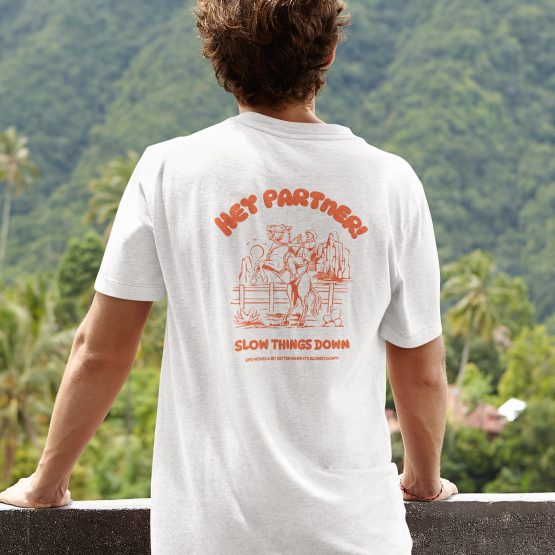 Bestel het Hey Partner Slow Things Down quote t-shirt in zwart of wit als je echt van het langzame leven bent. De ondertitel luidt: Life Moves A Bit Better When It's Slowed Down. Dit t-shirt met funny quote is gemaakt van 100% katoen en heeft een uniseks / herenfit. Leverbaar in maat XS t/m 5XL.