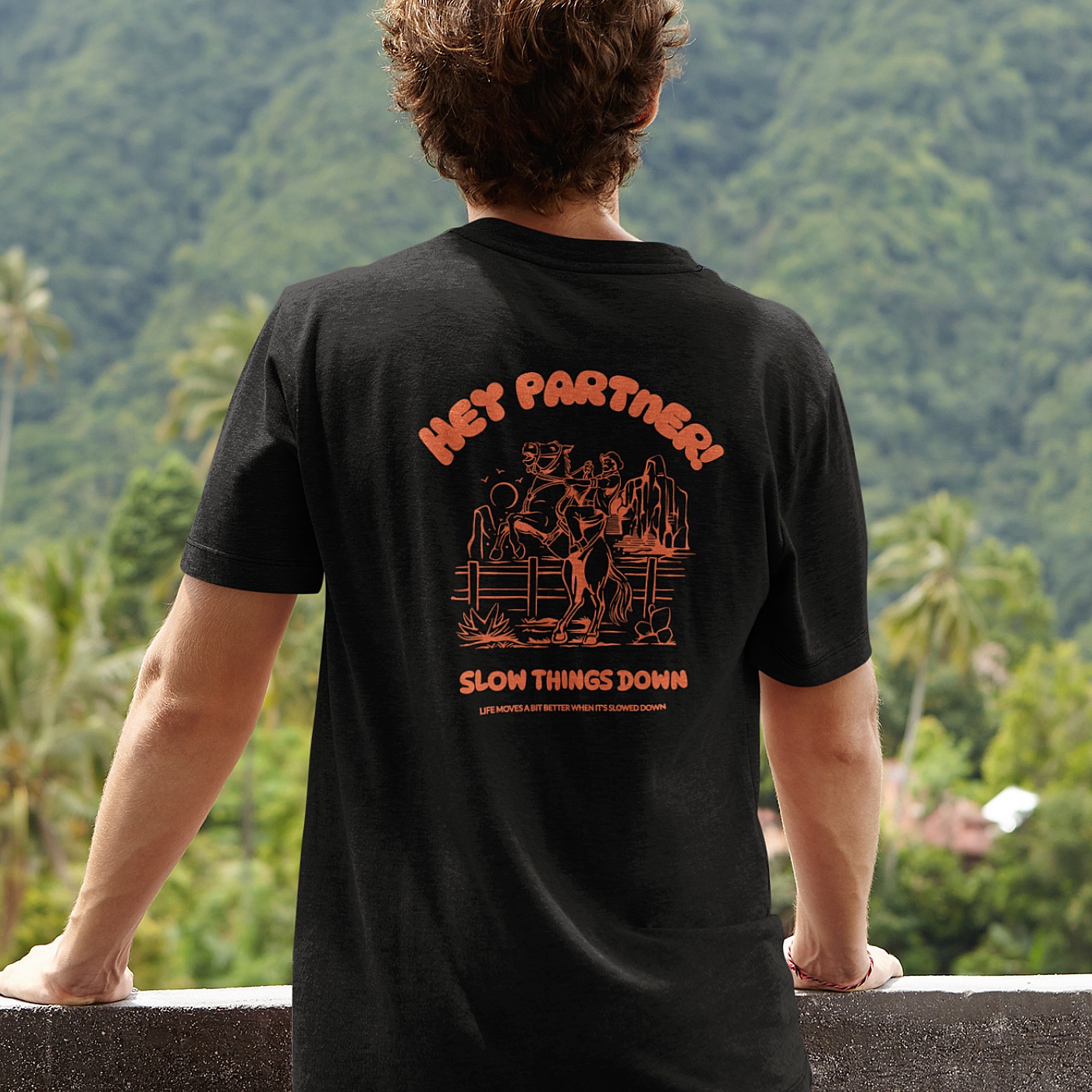 Retro Quote T-shirt Hey Partner Slow Things Down Back