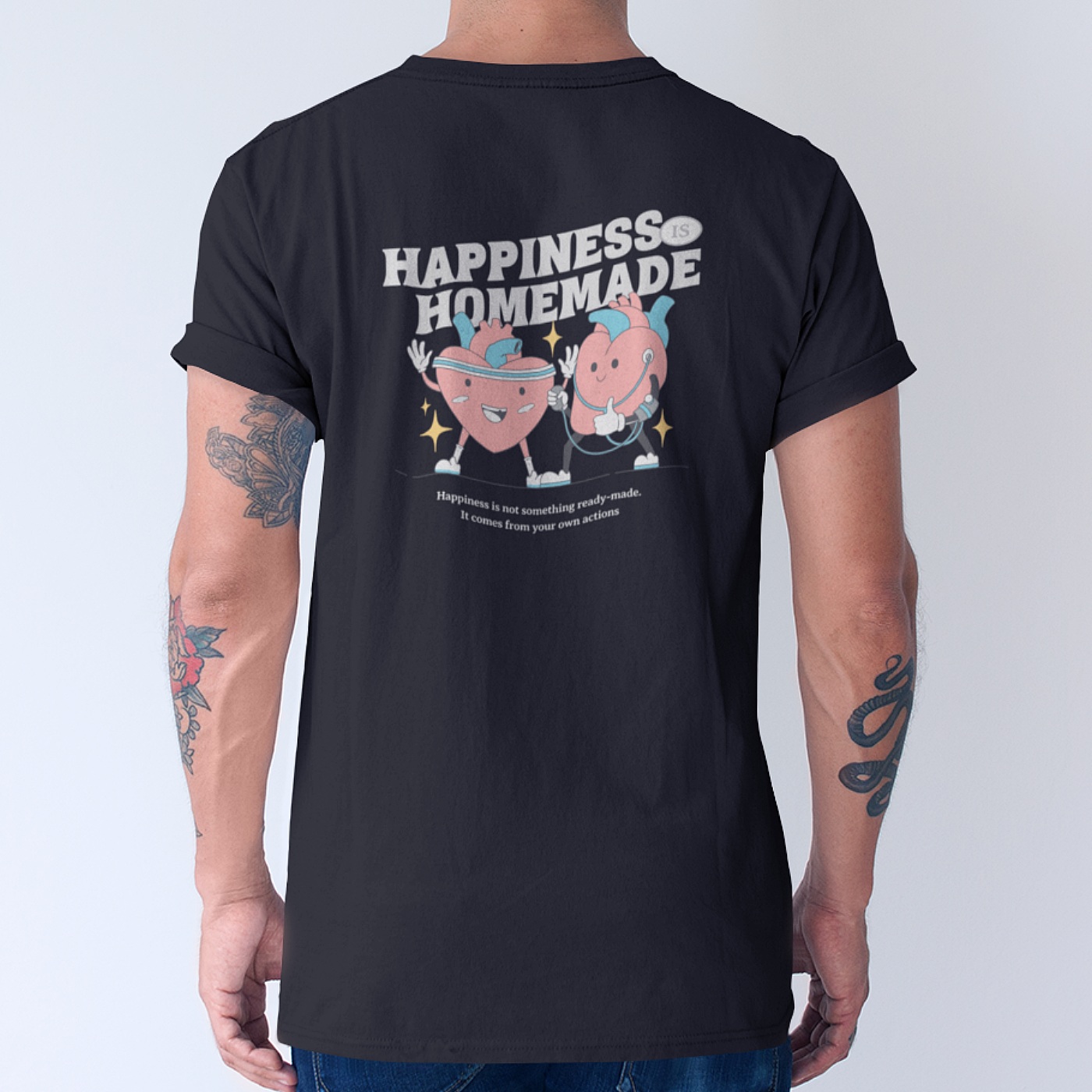 Het inspirerende retro quote t-shirt met Happiness Is Homemade is verkrijgbaar in de kleuren zwart en wit. Door het positieve ontwerp is het een perfecte outfit voor de zomer en lente. Maar ook in de herfst en winter is het shirt zeer geschikt als onderkleding. Gemaakt van 100% katoen met een uniseks / herenfit. Leverbaar in maat XS t/m 5XL.