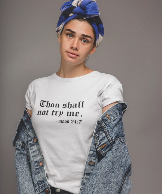 Het Thou Shall Not Try Me t-shirt is voor alle dames met een gezonde attitude! Bovendien leent deze uitspraak zich natuurlijk uitstekend voor moeders en partners met een gezinnetje. De kleding heeft een damesvorm en is te verkrijgen in vier kleuren: zwart, wit, rood en roze. (Let op: alle kleding heeft een witte opdruk, behalve de witte variant.)