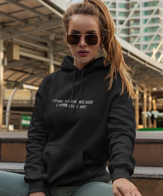 Deze streetwear hoodie met 'I Stare At You Because I Appreciate Art' is voor iedereen die van mensen en kunst houdt. Op feesten en festivals doet deze tekst hoodie het dan ook uitstekend! Dankzij de uniseks pasvorm heeft deze sweater een comfy fit voor zowel dames als heren. Leverbaar in vier kleuren: zwart, wit, rood en geel.