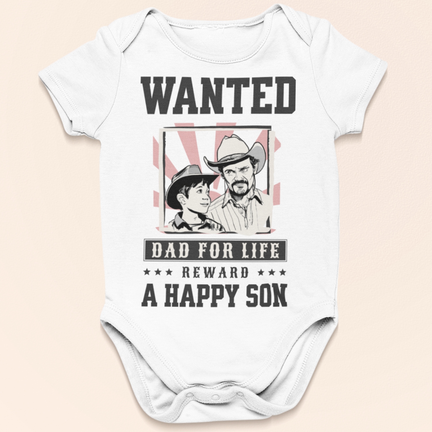 Bestel deze onesie met de tekst Wanted Dad For Life, Reward A Happy Son! Het is speciaal gemaakt voor jongetjes van 0 t/m 24 maanden. Als je papa of partner ontzettend van westerns houdt, dan is dit de ideale Vaderdag romper voor zijn kleine zoon.