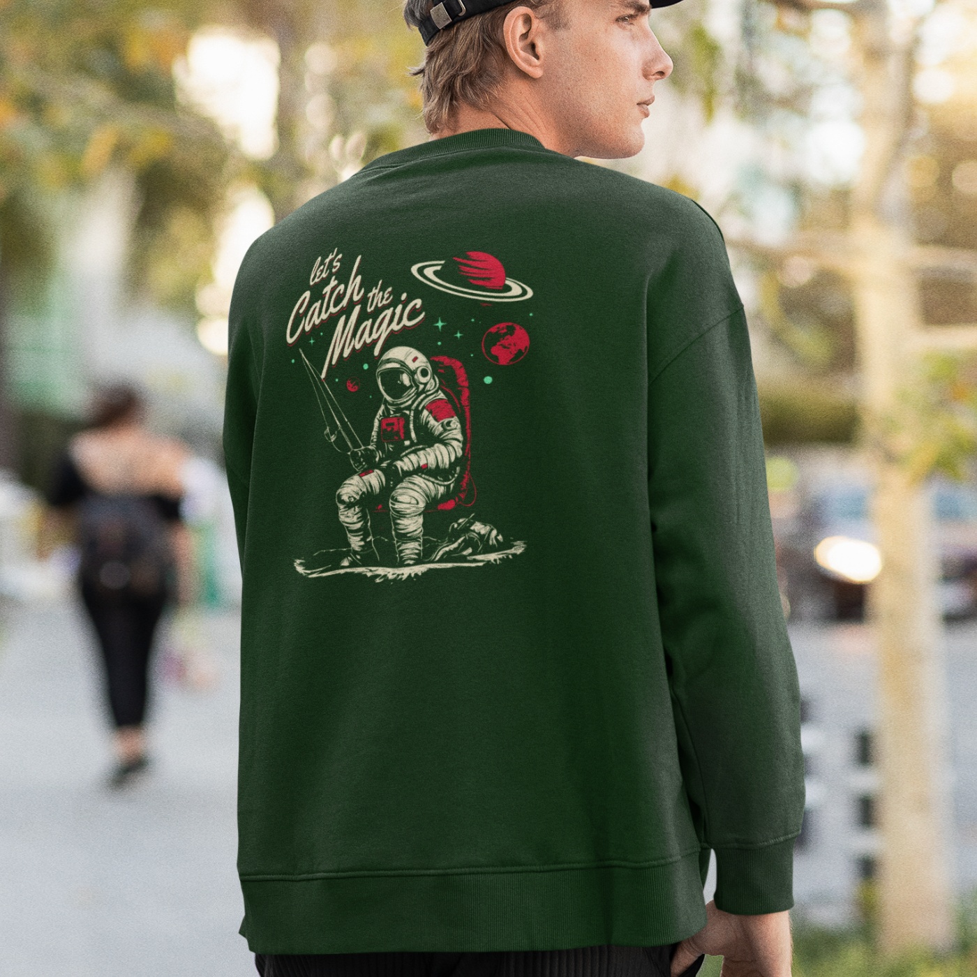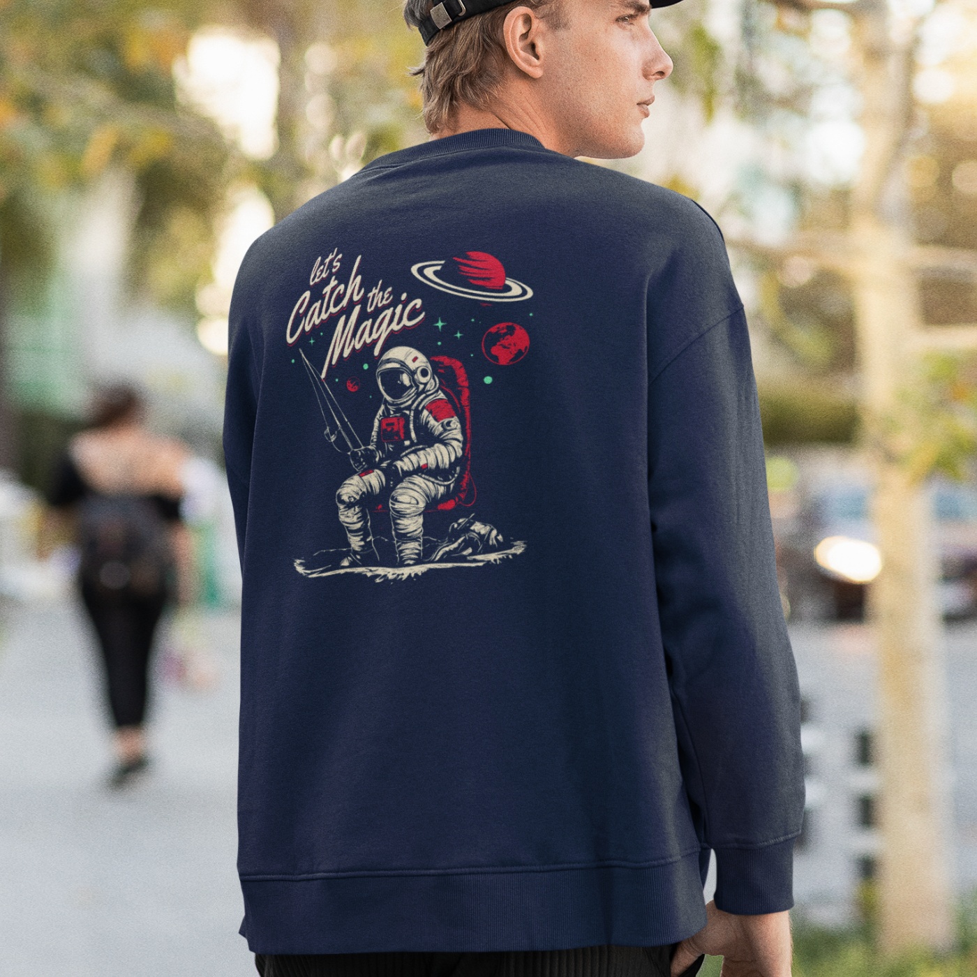Let's Catch The Magic skate sweater van Vayneberg, leverbaar in zwart, donkergroen en navy. De grote full color rugprint bestaat uit een astronaut die in de ruimte aan het vissen is. Door de comfortabele uniseks fit en is de trui erg geschikt om in te skaten of om casual te dragen. Kies uit de maten XS t/m 4XL.